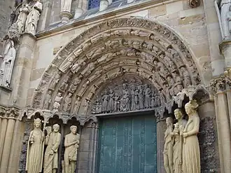 Aan weerszijden van de deuropening bevinden zich op een sokkelzone zes vrijstaande figuren. Van binnen naar buiten zijn dit links Adam en rechts Eva, links Andreas (met net) en rechts Johannes de Evangelist (met een met slangen gevulde gifbeker), links de personificatie van de kerk en rechts van de synagoge (Ecclesia en Synagoge). Hoger aan de gevel bevinden zich aan weerszijden van het timpaan links Noach en rechts Abraham, ieder met hun offer. Daar weer boven bevinden zich twee aan twee vier profeten: Jesaja, Ezechiël, Jeremia en Daniël. Tussen hen in bevinden zich aan weerszijden van het centrale venster de engel Gabriël en Maria: De annunciatie. Helemaal in de geveltop ten slotte, bevindt zich het laatste originele beeldhouwwerk. Hier bevindt zich de gekruisigde Christus geflankeerd door Maria en Johannes de Evangelist.