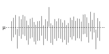 In de onderstaande figuur zijn 50 realisaties van een betrouwbaarheidsinterval met betrouwbaarheid 95% voor een onbekende parameter aangegeven.
