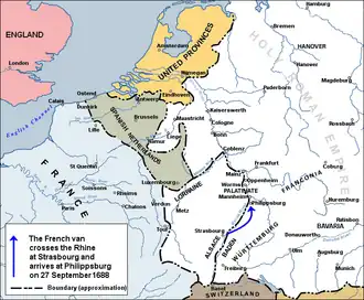 Lodewijk wilde de keizer en de Spaanse koning dwingen om Straatsburg en Luxemburg voorgoed af te staan. Ook wilde hij zijn Ottomaanse bondgenoot wreken, die door de keizer werd teruggedrongen door de ontwikkelingen van de Grote Turkse Oorlog. Hij vreesde dat, zodra de Ottomanen verslagen waren, het triomferende Duitse Rijk zich tegen Frankrijk zou richten. Lodewijk viel daarom de Palts binnen onder voorwendsel de rechtmatige opvolger van Karel II van de Palts te zijn (september 1688). Daarnaast veroverde hij de steden Philippsburg en Mainz (september en oktober 1688). De keizer haalde daarop de Zuid-Duitsers van het Ottomaanse front naar het Rijnland. De Noord-Duitse vorsten sloten zich bij hem aan in oktober 1688.