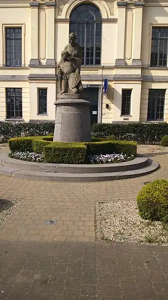 Het anonieme werk was bedoeld voor het Duitse militaire kerkhof op het Roggeveld, tussen Zarren en Essen. Maar de Duitsers kregen de gelegenheid niet om het gedenkteken er te plaatsen. Het beeld viel in de handen van de Belgen en na onderhandelingen werd het in 1920 of 1921 overgedragen aan de stad Torhout. Het stadsbestuur vond het kunstig en oordeelde dat het mits aanpassingen als gedenkteken op het Conscienceplein kon dienen. Een leeuw zou de adelaar vervangen, en een verband zou de Duitse helm camoufleren. De recuperatie zou de stadskas sparen en zo kon het geld aan broodnodige projecten besteed worden.