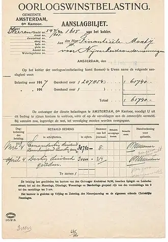 Als gevolg van onder meer de mobilisatie van het Nederlandse leger en de bijbehorende verdedigingsinspanningen tijdens de Eerste Wereldoorlog (28 juli 1914-11 november 1918) liepen de overheidstekorten rap op. Dat deed de regering besluiten om de tarieven van de inkomstenbelasting en de vermogensbelasting te verhogen (middels de Verdedigingsbelasting) en nieuwe belastingen in het leven te roepen, met name de Oorlogswinstbelasting. Want wat was beter te verdedigen dan het invoeren van een belasting op extra bedrijfswinsten die gemaakt werden juist door het profijt dat sommige bedrijven hadden van die oorlog?