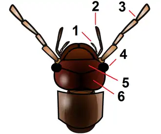 Aan de voorzijde van de kop zijn twee paar tasters aanwezig, die aan de bovenzijde worden de labiale palpen of liptasters (1) genoemd en die aan de onderzijde de maxillaire palpen of kaaktasters (2). De oorworm heeft bijtende monddelen (prognaath) aan de voorzijde van de kop. De kop draagt twee duidelijk gesegmenteerde antennes (3), die bij de meeste soorten vrij lang zijn. Het aantal segmenten kan oplopen tot 52 maar meestal is het aantal kleiner. Bij de bekende gewone oorworm komen 15 segmenten voor.[12] De antennes hebben een tastzintuiglijke functie en dienen om prooien en soortgenoten op te sporen. De ogen (4) zijn klein en kraal-achtig en meestal vrij goed zichtbaar door de lichtere kleur van de kop. Oorwormen verschillen van veel gevleugelde insecten doordat ze geen ocelli hebben. Deze structuren komen wel voor bij enkele grote insectengroepen zoals de kevers, de vliesvleugeligen, de rechtvleugeligen en de libellen. Ocelli zijn drie kleine 'bij-oogjes' aan de bovenzijde van de kop. De voorouders van de oorwormen hadden wel ocelli, maar zijn deze in de loop der evolutie weer verdwenen. De voorzijde van de kop of clypeus (5) is bij veel soorten onbehaard. De bovenzijde van de kop wordt beschermd door een plaat die het kopschild of vertex (6) wordt genoemd.
