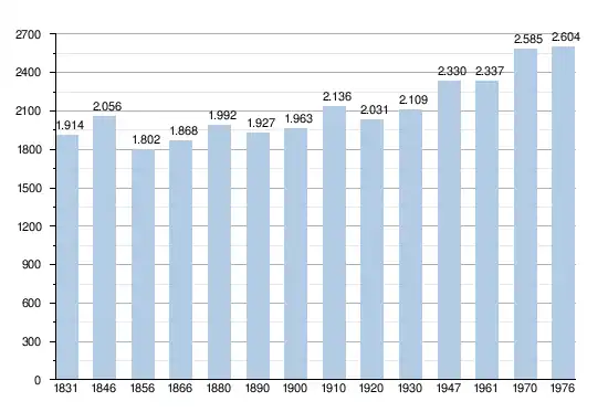 - Bronnen:NIS, Opm:1831 tot en met 1970=volkstellingen; 1976 = inwoneraantal op 31 december