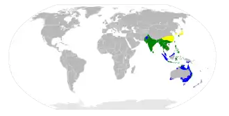 Het verspreidingsgebied strekt zich uit van India tot zuidelijk in Australië en noordelijk tot in Japan.