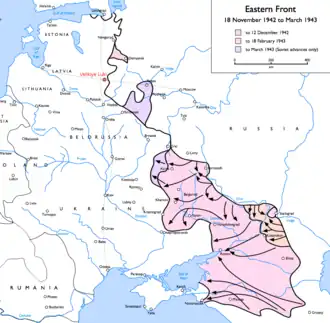 Door de val van Stalingrad kwamen vele Sovjetlegers vrij voor andere taken. Noordelijker aan de Don werden de zwakke Italiaanse en Hongaarse legers verpletterd. De hele zuidelijke helft van het front begon nu uiteen te vallen en de pantserspitsen van het Rode Leger spoedden zich onstuitbaar naar het westen richting de Dnjepr. In het noorden forceerden de Sovjets in januari een nauwe bevoorradingsroute naar Leningrad. In deze stad waren toen in totaal 300.000 militairen gesneuveld en duizenden burgers door Duitse bombardementen omgekomen. Het grote en langdurige voedseltekort eiste echter een nog veel hogere tol: één miljoen burgers waren door uithongering gestorven. Tegelijkertijd met Operatie Uranus voerden de Sovjets vanaf 25 november een nog veel groter offensief uit: Operatie Mars, gericht tegen Heeresgruppe Mitte. Men had de ambitie zo in één winter het Duitse leger te vernietigen. Deze aanval mislukte echter, maar Heeresgruppe Mitte had toch niet meer de kracht om ook nog de zuidelijke dreiging te pareren. De mankracht en het aantal tanks waren weer teruggevallen naar het lage niveau van de lente van 1942.