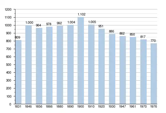 - Bronnen:NIS, Opm:1831 tot en met 1970=volkstellingen; 1976 = inwoneraantal op 31 december