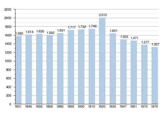 - Bronnen:NIS, Opm:1831 tot en met 1970=volkstellingen; 1976 = inwoneraantal op 31 december