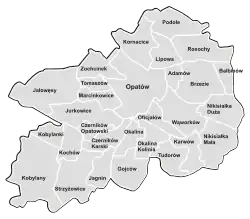 Adamów, Balbinów, Brzezie, Czerników Karski, Czerników Opatowski, Gojców, Jagnin, Jałowęsy, Jurkowice, Karwów, Kobylanki, Kobylany, Kochów, Kornacice, Lipowa, Marcinkowice, Nikisiałka Duża, Nikisiałka Mała, Oficjałów, Okalina, Okalina-Kolonia, Opatów, Podole, Rosochy, Strzyżowice, Tomaszów, Tudorów, Wąworków, Zochcinek.