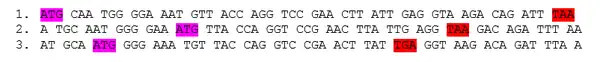 - ATG (Adenine – Thymine – Guanine). Komt het meeste voor.