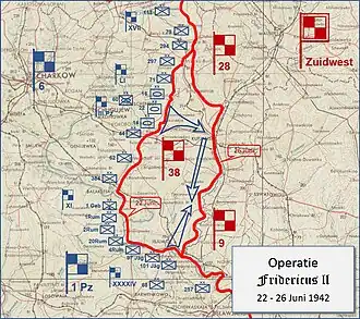Laat in de nacht van 14 juni stuurde het OKH (Oberkommando des Heeres) aan Maarschalk Fedor von Bock (Heeresgruppe Süd) Hitlers order voor de uitvoering van ‘Fridericus II’ en het lanceren van ‘Blau I’, zo snel als de Luftwaffe de nodige luchtsteun zou kunnen geven. De Luftwaffe was namelijk ook nog druk bezig met het breken van het beleg van Sebastopol. De vroegst mogelijke datum voor ‘Blau I’ was daarmee 23 juni. De start van ‘Fridericus II’ was gepland voor 17 juni, maar de dagelijkse regenstormen betekenden dat de voorbereidingen niet voor 20 juni klaar zouden zijn, en de operatie startte daadwerkelijk op 22 juni, om 02:15. Hitler had nog geprobeerd de aanval van het 3e Pantserkorps iets noordelijker aan te zetten, maar de generale staf kon Hitler overtuigen dat dit geen goed idee was en ook een latere start van het offensief zou betekenen. Opnieuw was het 3e Pantserkorps de primaire Duitse eenheid voor deze operatie. Het 3e Pantserkorps zou aanvallen van het gebied van Tsjoegoejev naar het zuidoosten in de richting van Koepjansk en daarna zuidwaarts draaiend, direct zuid langs de rivier de Oskol. In het zuiden zou het Duitse 44e Legerkorps (Generaal Maximilian de Angelis) de Donets-rivier oversteken tussen Izjoem en de monding van de Oskol-rivier, en naar het noordoosten oprukken om het 3e Pantserkorps te ontmoeten bij Gorochovatka. Deze beweging zou in de flank gedekt worden door het gehele 6e Roemeense Legerkorps. Elementen van het Duitse 51e Legerkorps (Generaal Walter von Seydlitz-Kurzbach) zouden opereren tussen beide Korpsen en deels noordelijk van het 3e Pantserkorps. Op de eerste dag rukte het 3e Pantserkorps op tot halverwege Koepjansk en draaide daarna 3 divisies, met de 22e Pantserdivisie voorop, naar het zuiden. Het 44e Legerkorps veroverde een bruggenhoofd over de Donets, maar de opmars was moeilijk door zompige doorgangen door de bossen, die ook nog vol mijnen lagen. Maar al de volgende morgen (23 juni) waren de Russen vanaf het front aan de Donets tussen Koepjansk en Izjoem op de terugtocht naar het oosten, richting de Oskol. Ondertussen werden ze door de Luftwaffe hevig aangevallen.
