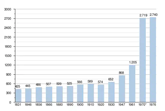 - Bronnen:NIS, Opm:1831 tot en met 1970=volkstellingen; 1976 = inwoneraantal op 31 december