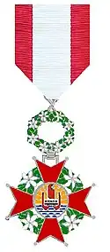 - Commandeur - De commandeur draagt een groot uitgevoerd gouden kleinood van de orde aan een lint om de hals. Er is als verhoging een krans van gardeniae tussen het juweel en het lint aangebracht.