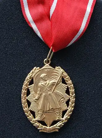 Het versiersel is een ovaal opengewerkt gouden medaillon met daarin een soldaat met in de ene hand een geweer en in de andere hand een vlag met een ster. Dit kleinood wordt aan een rood lint met een witte streep langs de rand om de hals gedragen.