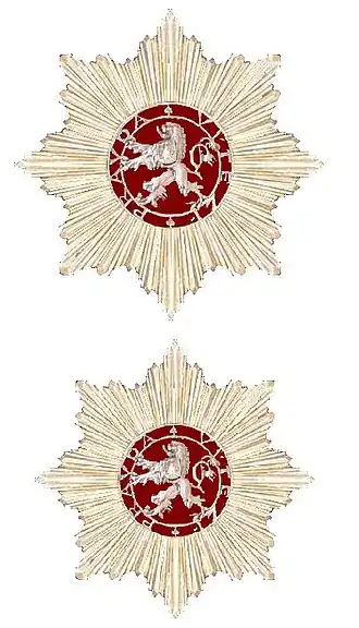 - ↑ The President of the Republic shall be entitled to wear the insignia of the First Class of the Order, including the collar chain of the Order. After a President has left office, the insignia may be conferred upon him/her for life if both Chambers of the Parliament decide so. Statutes. Annex to the Law No. 157/1994 Coll. Art. 4