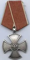 Het kleinood van de orde is een zilveren kruis met een Russisch wapen in het midden. Het wordt aan een rood lint met een smalle grijze bies gedragen. In de praktijk is het lint donkerrood terwijl de statuten purperrood voorschrijven.