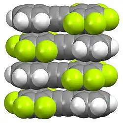 In tegenstelling tot de waterstof-analoga, vormen de perfluoraromaten mengkristallen met niet-gefluorideerde aromaten. De alternerende stapeling ontstaat als een gevolg van donor-acceptor-interacties tussen de verschillende pi-systemen. Pentafluortolaan is een voorbeeld van een molecule dat het fluorgedeelte én het waterstofgedeelte in zich verenigt, zie figuur 2.[8]