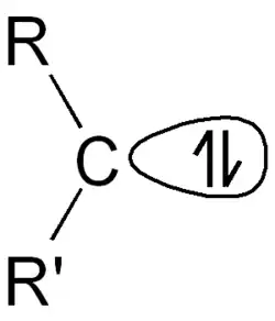 De weergave van een singletcarbeen (zie figuur 3) is voor het difluorcarbeen slechts een deel van het plaatje. Zowel R als R' zijn hierbij fluoratomen. Er zijn twee aspecten die een rol spelen: