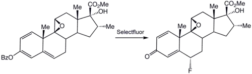 De elektrofiele fluoridering maakt gebruik van een bron van F+. Vaak maken dergelijke reagentia gebruik van een stikstof-fluorbinding, zoals in selectfluor, figuur 5. Asymmetrische fluoridering, waarbij slechts een van de twee mogelijke enantiomeren gevormd wordt uit een prochiraal substraat, maken vaak gebruik van elektrofiele fluorideringsreagentia.[10]