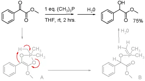 Fosfines kunnen ook optreden als reductor, zoals in de Staudinger-reactie waarin aziden tot amines gereduceerd worden, en de Mitsunobu-reactie die wordt toegepast om alcoholen om te zetten in esters. In al deze reacties wordt het fosfine omgezet in het fosfineoxide. Ook geactiveerde carbonylgroepen kunnen met fosfines gereduceerd worden: α-keto-esters worden bijvoorbeeld tot de α-hydroxy ester omgezet (zie onderstaand reactieschema).[7] In het voorgestelde reactiemechanisme wordt eerst een proton van een van de methylgroepen "geleend", in de laatste reactiestap worden de atomen van een molecuul water verdeeld over het zuurstofatoom dat het fosforatoom aan de rest van het molecuul bindt, de methyleengroep en het fosforatoom, dat tot fosfineoxide wordt omgezet. Het gebruik van een van de methylwaterstofatomen wordt ondersteund door het feit dat de reactie met trifenylfosfine niet verloopt.