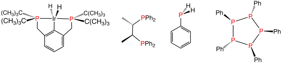 Verschillende organische (poly)fosfines: een complex van een tweewaardig organisch ligand, een chiraal difosfine dat als homogene katalysator wordt toegepast, het primaire fosfine PhPH2 en een fosfor(I)verbinding (PPh)5..