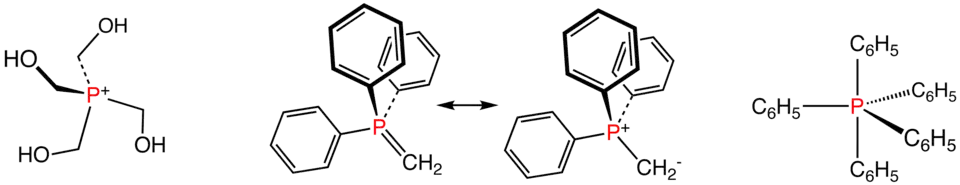 Enkele voorbeelden van fosfor(V)verbindingen: het fosfoniumion P(CH2OH)4+, twee resonantiestructuren voor het Wittig-reagens Ph3PCH2 en pentafenylfosforaan, een zeldzame verbinding waarin fosfor vijf liganden heeft.