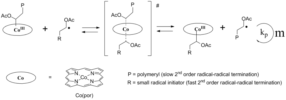 Als het monomeer goed toegankelijke (voor radicaalreacties) waterstofatomen bevat kan chain-transfer optreden. Dit verschijnsel treedt niet op bij acrylaten en vinylesters als vinylacetaat. Het principe van deze reacties is, onafhankelijk van elkaar, in 1994 door twee groepen ontdekt.[5] De beschreven katalysatoren zijn vaak derivaten van kobaloximes, kobaltporfyrines of Co(acac)2, doorgaans toegepast in combinatie met andere radicaal-initiators.