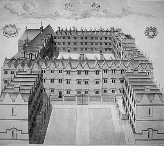 Van de originele gebouwen, La Oriole en de kleinere St Martin's Hall in het zuidoosten, staat niets meer overeind. Beide gebouwen werden gesloopt toen de quadrangle werd gebouwd in de 17e eeuw. De zuid- en westzijde en de klokkentoren werden gebouwd rond 1620 tot 1622; de noord- en oostzijde en de kapel dateren van 1637 tot 1642.[2]