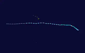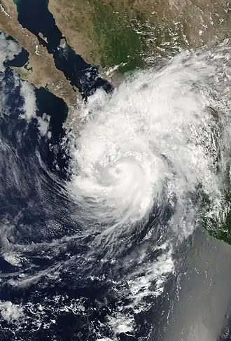 Cosmes koers over de Stille Oceaan.Orkaan Cosme op haar hoogtepunt op 16 juli met windsnelheden tot 120 km/uur en een minimale druk van 987 hPa.