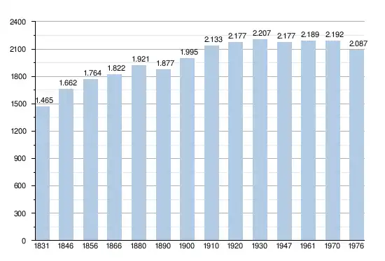 - Bronnen:NIS, Opm:1831 tot en met 1970=volkstellingen; 1976 = inwoneraantal op 31 december