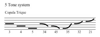 Het Trique dat in Copala wordt gesproken heeft een gemengd systeem, drie toonhoogten maar met toonhoogteverloop over vijf registers.