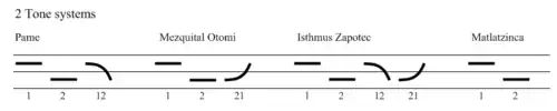 In de Oto-Pameaanse talen is een beperkt systeem gebruikelijk, met twee toonhoogten en slechts een combinatie. Het Matlatzinca en Chichimeca Jonaz hebben alleen registertonen en geen verloop.