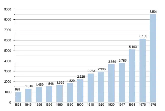 - Bronnen:NIS, Opm:1831 tot en met 1970=volkstellingen, 1976= inwonersaantal op 31 december