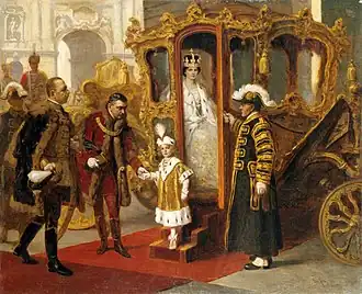 De aankomst van de kleine kroonprins Otto bij de kroning van Karel I tot koning van Hongarije in 1916. In de koets zit zijn moeder Zita