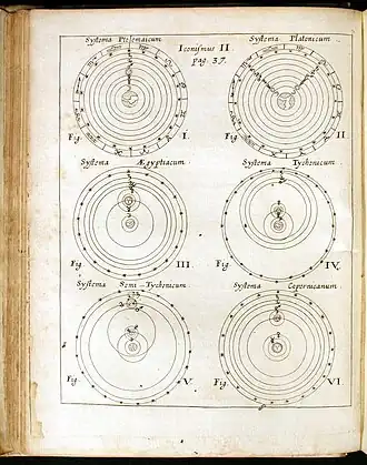 Bladzijde 37 uit Athanasius Kirchers Iter Extaticum Coeleste, 1671. Hierop staan enkele kosmologische modellen afgebeeld. I: volgens Ptolemaeus. II: volgens Plato. III: pseudo-Egyptisch (Vitruvius, Macrobius, Capella e.a.). IV: volgens Tycho Brahe. V: semi-tychoaans. VI: volgens Copernicus. Modellen III t/m V zijn semi-heliocentrisch.