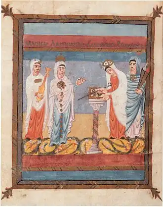 Het quadrivium, basis van het middeleeuwse onderwijs. Astrologia staat geheel rechts. Boëthius, De institutione arithmetica, 845. Bamberg, Msc.Class.5, fol. 9v.
