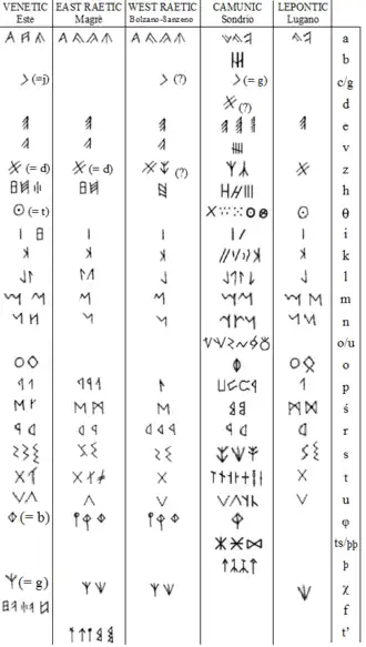 Het alfabet van Sanzeno (en ook dat van Bozen), ongeveer 100 Rhaetische inscripties. Het alfabet van Magrè (nabij Schio), Oost-Rhaetiaanse inscripties.