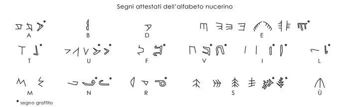 Het Nuceriaanse alfabet is gebaseerd op inscripties gevonden in Zuid-Italië (Nocera Superiore, Sorrento, Vico Equense en andere plaatsen). Er zijn alleen voorbeelden gevonden van tussen de 6e en 5e eeuw voor Christus. Het belangrijkste teken is de /S/, in de vorm van een dennenboom of vissengraat, en mogelijk een afleiding van het Fenicisch alfabet.