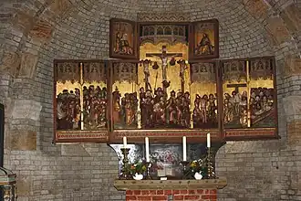 In de apsis staat een laatgotisch vleugelaltaar van een onbekende meester. Het werd rond 1460 gemaakt, vermoedelijk in een atelier in Hamburg of Lübeck. Aan de toonzijde ziet men zeven eikenhouten scènes uit de lijdensgeschiedenis van Jezus onder baldakijnen met maaswerk; centraal in het verhoogde middenveld wordt de kruisiging uitgebeeld. Op de binnenvleugels zijn 16 schilderijen uit het leven van Maria te zien. Op de rugzijde bevinden zich nog fragmenten van de Gregoriusmis en de Martelarenboom. De beide bovenste zijvleugels tonen Anna te Drieën en de heilige Andreas. Een voorstelling van het Laatste Avondmaal uit een latere periode siert de predella.