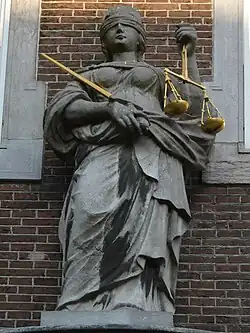 Boven de ingang staat een beeld van een vrouw met een blinddoek en een weegschaal, vrouwe Justitia. Tot de Franse tijd werd er ook recht gesproken in het stadhuis. In een vierschaar in de hal bevonden zich de schepenen, de griffier en de schout. Aan het eind van de 19de eeuw verhuist het recht naar het Gerechtsgebouw Breda aan de Kloosterlaan.