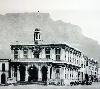 Op 10 maart 1710 besloot de Burgerraad het huidige Groentemarkplein aan te leggen.[1] Op de plaats van het Oude Stadhuis stond kort na 1716 al een kleiner, één bouwlaag tellend gebouw met een rieten dak, dat ook toen al dienstdeed als onderkomen voor de Burgerwacht (een politiemacht ten dienste van de "vrije burgers" van Kaapstad). In de jaren 1740 besloot men dit gebouw uit te breiden met een verdieping en het een plat dak te geven om ruimte te bieden aan de militaire uitrusting van de wacht. De eerste steen van dit nieuwe gebouw werd in 1755 gelegd door Baerndt Artoijs, lid van de Raad van Justitie. In 1756 trokken Burgerwacht en Burgerraad in het gebouw, dat in 1761 voltooid werd. De kosten bedroegen 33.000 VOC-gulden. De architect van het gebouw is onbekend, maar het houtsnijwerk in de bovenlichten van de ramen is toe te schrijven aan de Groninger Johannes Struwing. In 1764 legde tekenaar Johannes Rach het nieuwe gebouw vast: een twee bouwlagen tellend gebouw met aan de voorzijde vijf muurvlakken en een decoratieve, rococo borstwering met daarop zes vazen (zie afbeelding links). Van 1796 tot 1826 kwam de Burgersenaat in het gebouw samen.