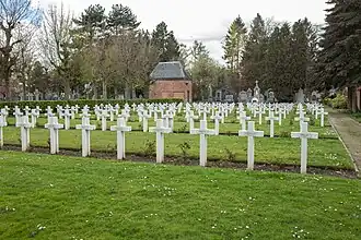 Aan beide zijden van het hoofdpad ligt een perk met Franse militairen. Voor het rechtse perk staat het grafmonument van Ferdinand le Hétet. Er ligt ook 1 Brits graf tussen de Franse graven. Voor het linkse perk staat een monument ter ere aan de bevrijders van de stad. Achteraan dit perk ligt een massagraf met 264 lichamen. In beide perken samen liggen meer dan 700 doden.
