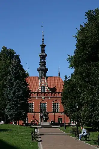 Het raadhuis werd gebouwd in de stijl van het Nederlandse maniërisme. Het bijna vierkantige gebouw heeft een slanke toren. Op de fries tussen beiden etages is het wapenschild van Polen, Pruisen en Gdańsk afgebeeld. De bekendste burgemeester die in het raadhuis zetelde was astronoom Johannes Hevelius.