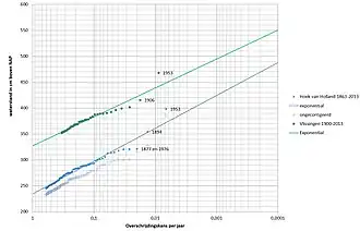 Door de punten kan een regressielijn getrokken worden, en aan de hand van deze lijn kan dus een waterstand met een bepaalde kans afgelezen worden. Volgens deze grafiek is de 1/4000e (kans 2,5 · 10-4) waterstand 5,3 m boven NAP.