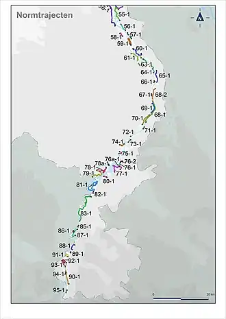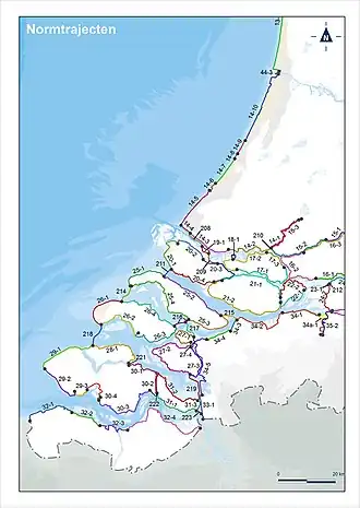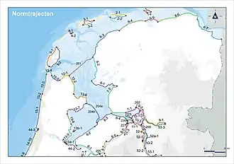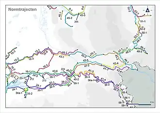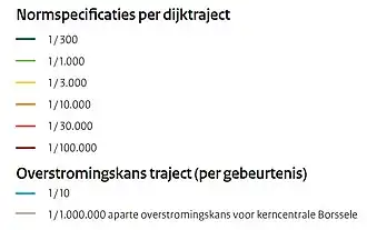 In de Waterwet zijn de volgende dijktrajecten gedefinieerd zoals in de figuren aangegeven. De kleuren geven de toelaatbare overstromingskans aan (zie de figuur "Legenda").