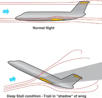 Als het vliegtuig echter te ver doorgaat in de overtrek, komt het in een zogenaamde deep stall, te zien op de afbeelding hiernaast. In deze situatie zit het stabilo met het hoogteroer in het turbulente zog van de hoofdvleugel en zal daardoor geen lift geven. Het hoogteroer van het vliegtuig is dan niet bruikbaar en het vliegtuig kan onbeheersbaar hoogte verliezen. Vooral vliegtuigen met een T-staart, zoals op deze afbeelding, hebben hier last van.