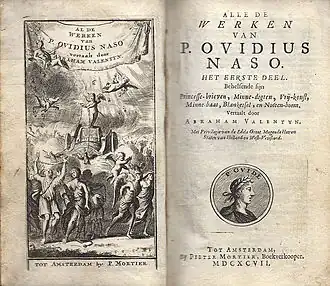 - 1678 - Abraham Valentijn. Al de werken van P. Ovidius Naso. Het eerste deel: behelsende de Princesse-brieven, Minne-digten, Vrij-konst, Minne-baat, Blanketsel, en Nooten-boom.[k] Tot Leiden, bij Daniel van Gaasbeek