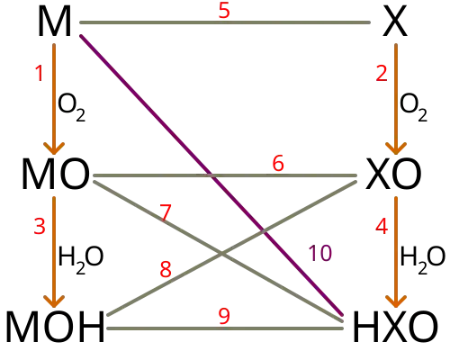 In het schema hiernaast is de relatie weergegeven tussen elementen, hun oxides, de reactie van de oxides met water en de zouten die hieruit gevormd worden, of die bij ontleding de verschillende stoffen teruggeven. De nummers in onderstaande lijst verwijzen naar de nummers in het schema.