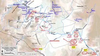 De Eerste Slag bij Bull Run begon in de vroege ochtend van 21 juli 1861 met een verrassingsaanval van beide legers. Zowel McDowell als Beauregard hadden een flankaanval om elkaars linkerflank uitgewerkt.[17] McDowell ging als eerste tot de aanval over, stak de Bull Run over en bedreigde de Zuidelijke linkerflank. Beauregard wou zijn eigen plan doordrukken en de Noordelijke linkerflank aanvallen bij Centreville. Johnston drong er echter op aan dat de linkerflank bij Henry House Hill zou versterkt worden. Toen Beauregard de sterkte van de vijandelijke aanval zag, vroeg hij aan Johnston om zich 2,4 km terug te trekken om vandaar uit de aanval te coördineren. Beauregard reed langs de slaglinies, sprak de soldaten toe en moedigde hen aan. De Zuidelijke linie hield stand.[18]