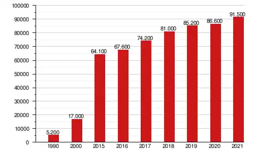 In de grafiek hieronder staat de overslag van containers bij de PSA terminals. De aantallen betreffen duizend TEU per jaar.