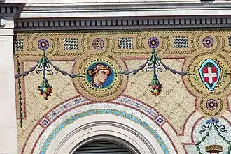 De gevels zijn versierd met mozaïeken uit Innsbruck. Het zijn allegorische hoofden van mannen en vrouwen die menselijke activiteiten uitbeelden. Daartussen zijn slingermotieven verwerkt. Oorspronkelijk waren er in de mozaïeken ook wapenschilden van het Habsburgse Huis ingewerkt.